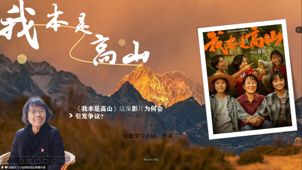 在学习分享环节中,舒英同志带领大家一起了解了影片《我本是高山》的争议点:影片是根据“时代楷模”张桂梅校长真实事迹改编的,电影将原型中酗酒父亲改成酗酒母亲,现实贫困环境下艰苦奋斗的女孩们改成逃课去逛街的女孩们,张桂梅校长办学初衷由对人民、对党的热爱被简单的归为爱情原因,影片不仅不尊重原型,甚至违背了事实,是对女性角色的污名化和对女性力量的削弱。我们应该尊重事实,尊重和学习像张校长那样坚定理想信念、无私奉献的人,同时希望未来的电影制作者们能够更加注重事实真相和人物形象的还原,让更多的人能够通过电影了解和感受这些人物的精神。