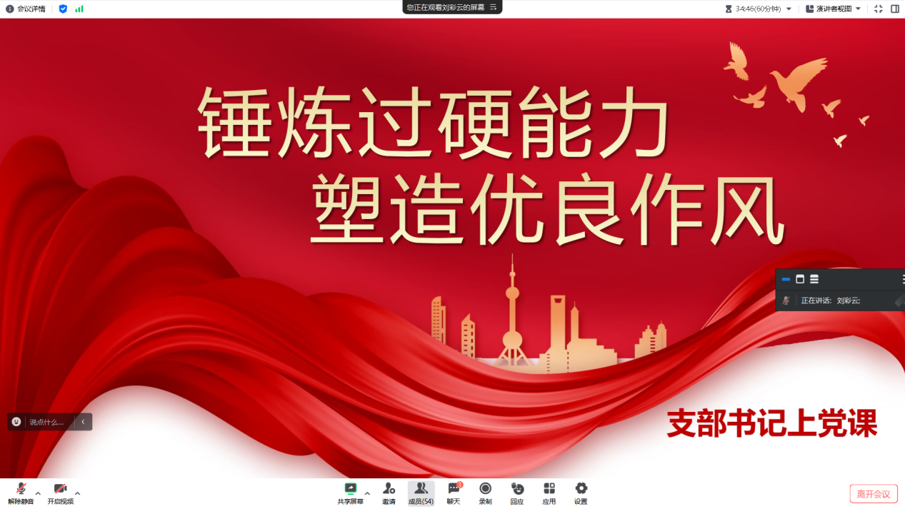 支部书记上党课 刘彩云同志以习近平总书记在二十届中央纪委二次全会上的讲话作为引入,从“思想是行动的先导”、“作风问题本质上是党性问题”、“作风与能力是干事成事双保险”、“作风建设永远在路上”四个部分进行讲解。她提出,高度重视作风能力建设是我们党的优良传统和一贯做法,是新时代全面从严治党的重要内容,我们党员要时刻保持“本领恐慌”的警醒,通过不断学习克服本领恐慌,坚持原则、净化生活圈、严格要求自身,用过硬的作风和超强的能力干实事。 刘彩云同志还提到,要抓好党员作风建设,不仅要从思想上坚决反对形式主义,党员的第一职责是为党工作,把爱党、忧党、兴党、护党落实到学习和生活的各项工作之中,而且要从制度上坚决扫除形式主义、官僚主义滋生蔓延的土壤,围绕落实“两个责任”,有针对性地补短板、堵漏洞、强弱项,健全完善各项制度措施,促进作风建设的常态化、规范化。