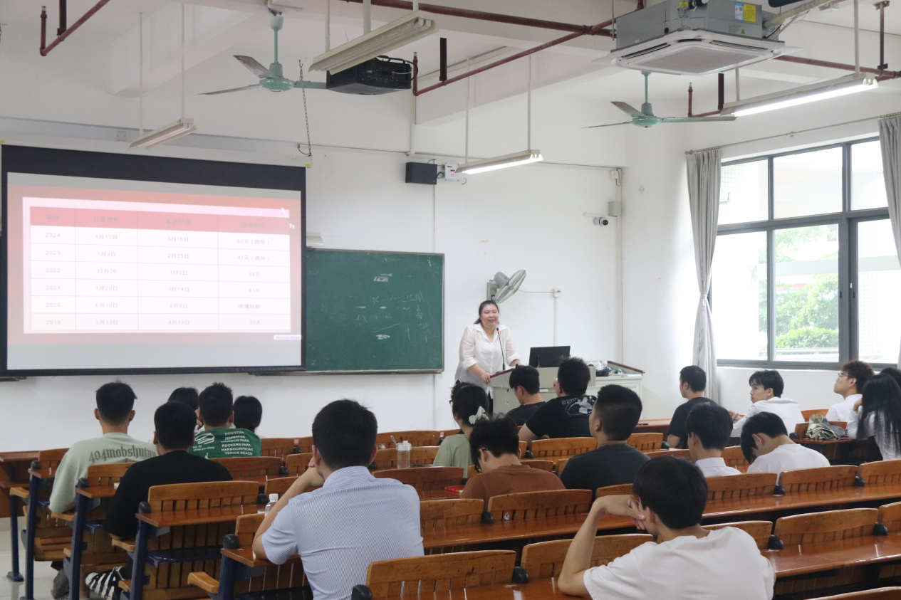 接着,专业老师先向同学们介绍了公务员考试大致情况,并讲解了公务员考试的备战方法和应试技巧是怎么考的,我们要如何备战专业老师她从四个方面提出备考建议:一是要提前规划好备考时间,制定相应的复习计划;二是要全方位系统的学习,追求专业化、精细化的学习;三是要学会总结反思,对错题理解透彻;四是要关注时事热点和政策变化,注重知识积累和实践能力的双提升