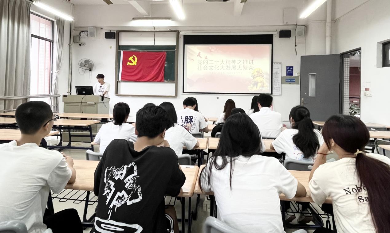 第二小组代表上台总结,他表明,党的二十大精神大力推进了社会文化大发展大繁荣,并向大家阐述了社会主义先进文化的基本内涵及党的二十大精神对文化建设的重大意义,指出我们要完整、准确、全面贯彻新发展理念,坚定文化自信,推进文化自强,紧紧围绕举旗帜、聚民心、育新人、兴文化、展形象的使命任务,以社会主义核心价值观为引领,为经济社会发展赋能、为实现中华民族伟大复兴的中国梦聚力。