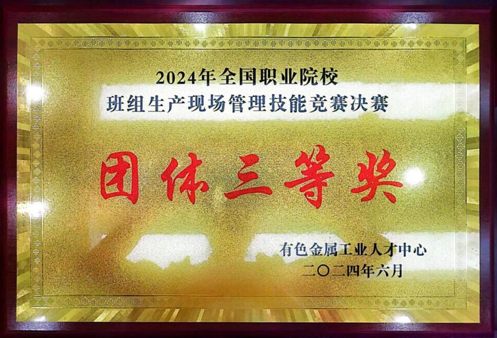 近日,由国家有色金属工业人才中心主办的“2024年全国职业院校班组生产现场管理技能竞赛决赛”在济宁职业技术学院落下帷幕。汽车工程学院23汽智1班陆逸民、23汽智2班李满儿荣获个人三等奖,詹琪琪、桂晶晶2位老师荣获“指导老师”称号,学校获得“团体三等奖”荣誉称号。
