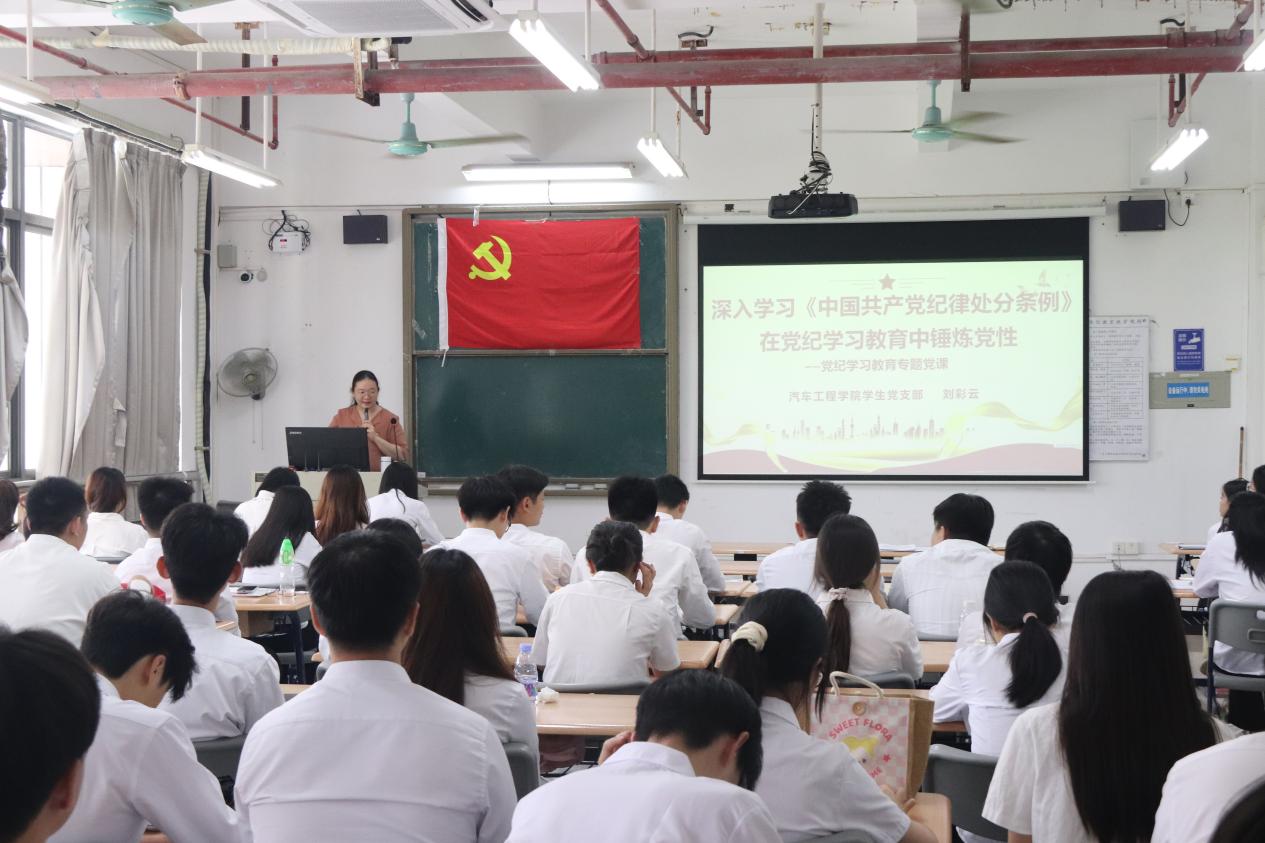 为进一步明确党员学生日常言行的衡量标尺,用党规党纪校正思想和行动,提高党员的党性修养,汽车工程学院学生党支部于6月21日下午在明德楼1-311开展《中国共产党纪律处分条例》专题党课学习,引导学生党员们学纪、知纪、明纪、守纪。本次会议由支部书记刘彩云主持,汽车工程学院党总支书记彭卫东、汽车工程学院辅导员以及支部全体正式党员和预备党员参加本次会议。