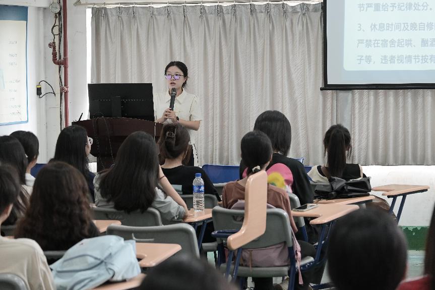 新生及家长合影留念 下午14点,新生班会如期举行,由班主任主持、助班辅助开展了新生开学第一次班会。班主任与新生们亲切交流,就学生行为规范、评奖评优标准、校园安全教育等关键事项进行了详尽解读与耐心指导,学生们认真倾听,主动询问,为系好大学生活的“第一粒扣子”打下坚实的基础。
