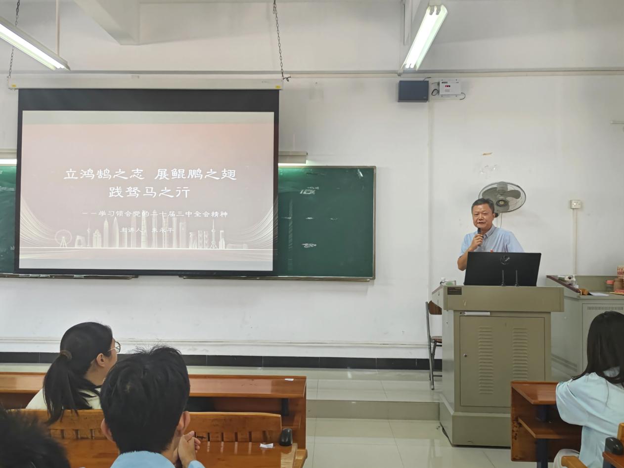 朱书记讲课现场 随后,朱永平围绕全会精神的核心内容从“党的二十大介绍”、“三个面对”、“习近平总书记在全会上的重要讲话精神”等方面进行了详细阐述。他通过生动的案例和深入浅出的讲解,使同学们对全会精神有了更加全面、深刻的理解。同时,他还结合个人成长经历和行业发展趋势为同学们未来的职业发展规划提供了宝贵的建议和指导。 最后,朱永平还提出了具体要如何学习贯彻党的二十届三中全会精神。他勉励同学们要以德立身,锤炼高尚情操;要自律自强,坚定理想信念;要全面发展,练就过硬本领。同时,他特别强调,希望大家能够深刻领会全会精神,将其内化于心、外化于行,以实际行动践行新时代青年的责任和担当。
