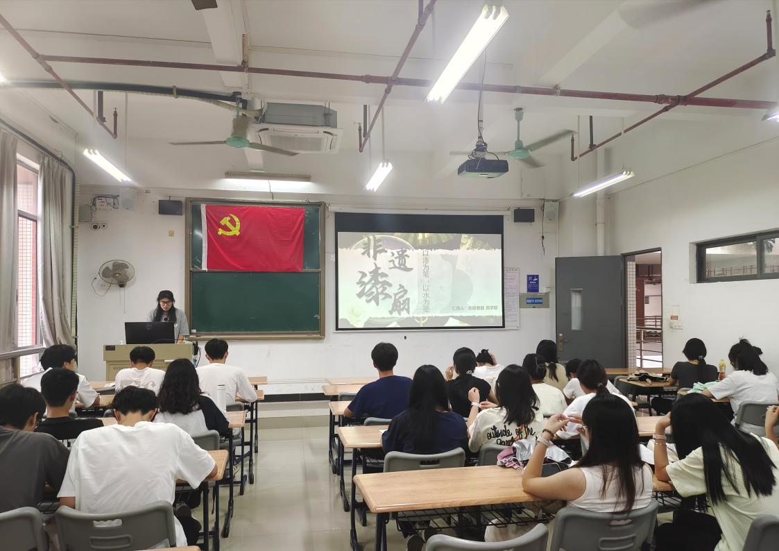 接下来,志愿者部高宇聪同志向大家分享了漆扇的相关知识,通过她的介绍,我们了解到了漆扇源于中华千年手工艺文化,以天然大漆为主材,经多道工序精心打造。漆扇不仅在工艺上精湛,而且在艺术表现上也十分成熟和多样化。唐代工匠们巧妙地运用各种漆艺技法,将精细的雕刻和丰富的色彩层次融入到扇面的创作中,使得漆扇的艺术魅力得到了极大的提升。