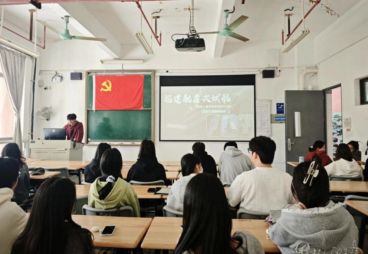 其次,志愿者部的麦振祺同志与大家分享福建舰的首次试航,大家了解到福建舰是中国第一艘电磁弹射航空母舰,福建舰的成功试航,为我国国防安全奠定了更加坚实的基础。