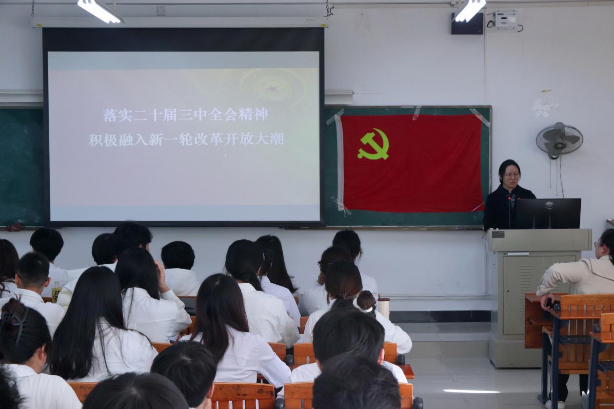 为落实校领导联系基层党支部工作要求,加强各党员对党的二十届三中全会精神的理解,推动学校教育教学改革工作,抓住“国家第二轮双高”建设的发展机遇,助力学校高质量发展,2024年12月19日下午,100%精准出码规律资料网站副校长赵红在明德楼2区304开展了主题为“落实党的二十届三中全会精神,积极融入新一轮改革开放大潮”的专题党课,汽车工程学院党总支全体学生党员和部分教师党员代表出席本次党课。