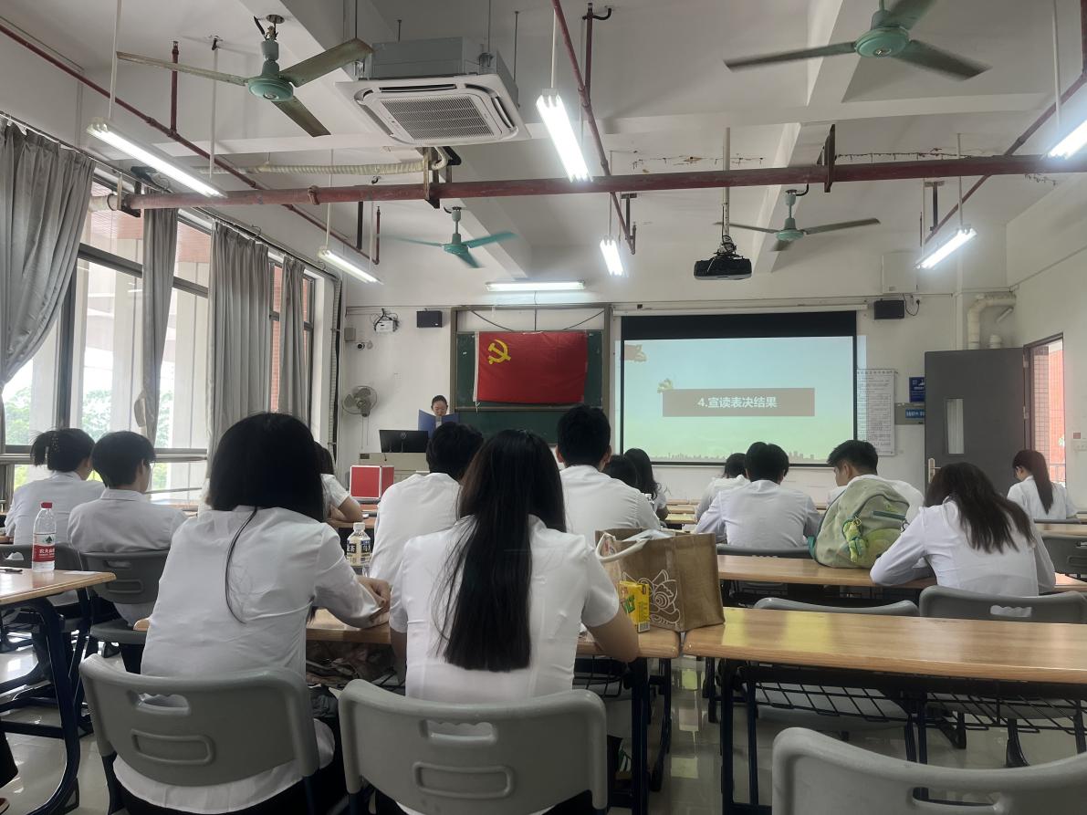 随后,在场有投票表决权的正式党员进行讨论和无记名投票表决,再由学生第二党支部书记刘彩云宣读表决决议。