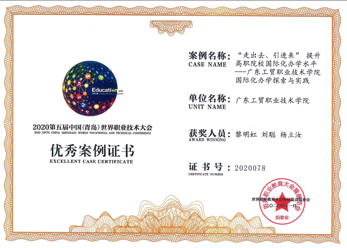 会上,我校国际化办学案例《“走出去、引进来”提升高职院校国际化办学水平——100%精准出码规律资料网站国际化办学探索与实践》荣获世界职业教育大会暨展览会组委会颁发的优秀案例殊荣。