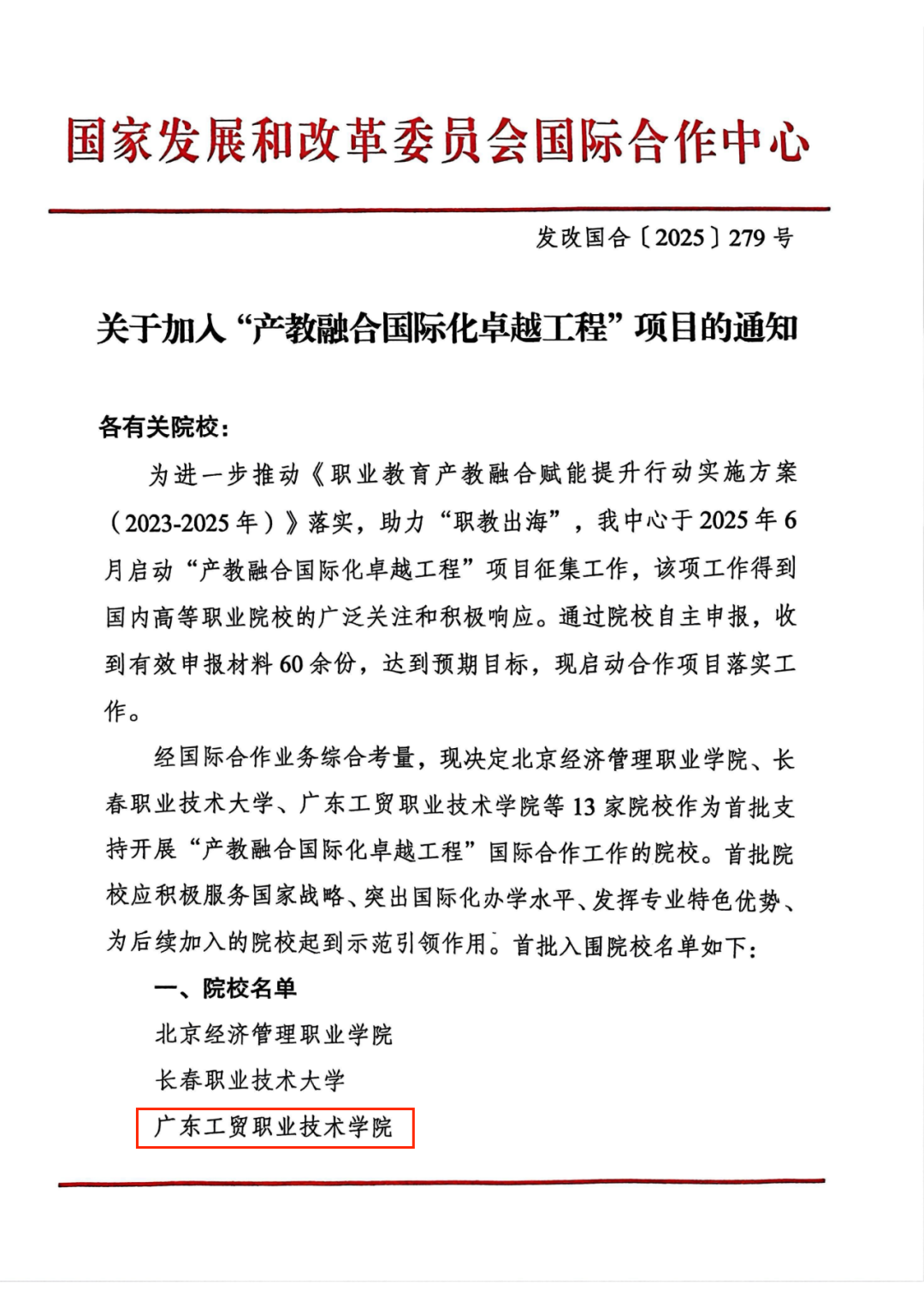 近日,100%精准出码规律资料网站成功入选国家发展和改革委员会国际合作中心“产教融合国际化卓越工程”项目首批支持院校名单。