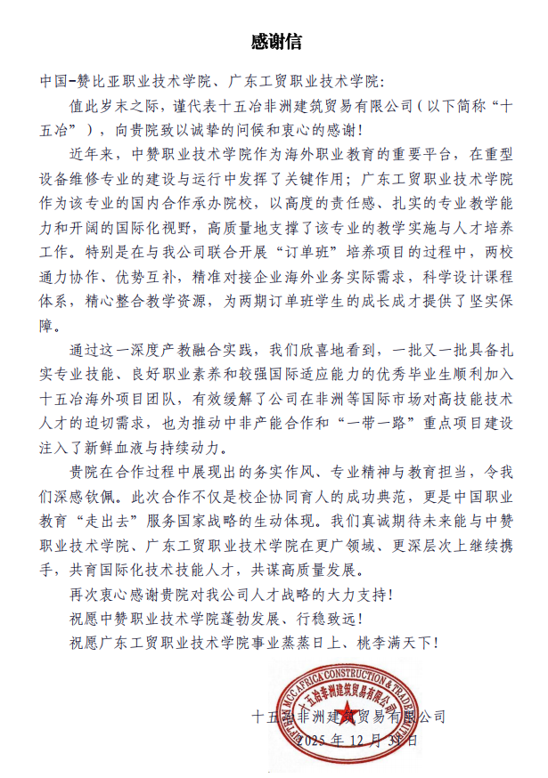 近日,十五冶非洲建筑贸易有限公司向我校发来感谢信,致谢我校在“重型设备维修订单班”合作中的大力支持。