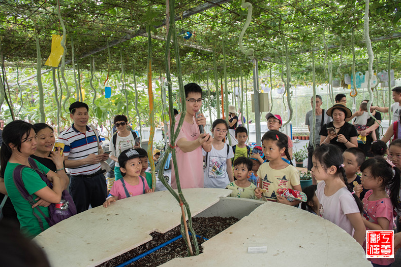 6月3日上午天气炎热,儿童及家长150多人乘座大巴从天河校区出发,怀着愉悦的心情来到农科院,我们一行受到了农科院热情欢迎,由谭德龙老师全程进行讲解示范。炎热的天气挡不住孩子们的求知热情,一个个吊在空中60多斤重的大冬瓜、一条条2米多长的蛇瓜、一串串10多个相连的甘薯,这些原本生长在农田土地中的蔬菜,现在神奇地生长在了无土的管道中,引起孩子们强烈的好奇心和求知欲;为使孩子们对无土栽培技术有初步的认识,谭德龙老师现场进行了讲解示范,如何把各种养分搭配、溶解在水里,不用泥土,植物靠这样的水也能生长的知识。孩子们在父母的陪伴下,自己动手、拿起工具种下一颗颗种子和幼苗,体验、感受了温室无土栽培技术的过程。