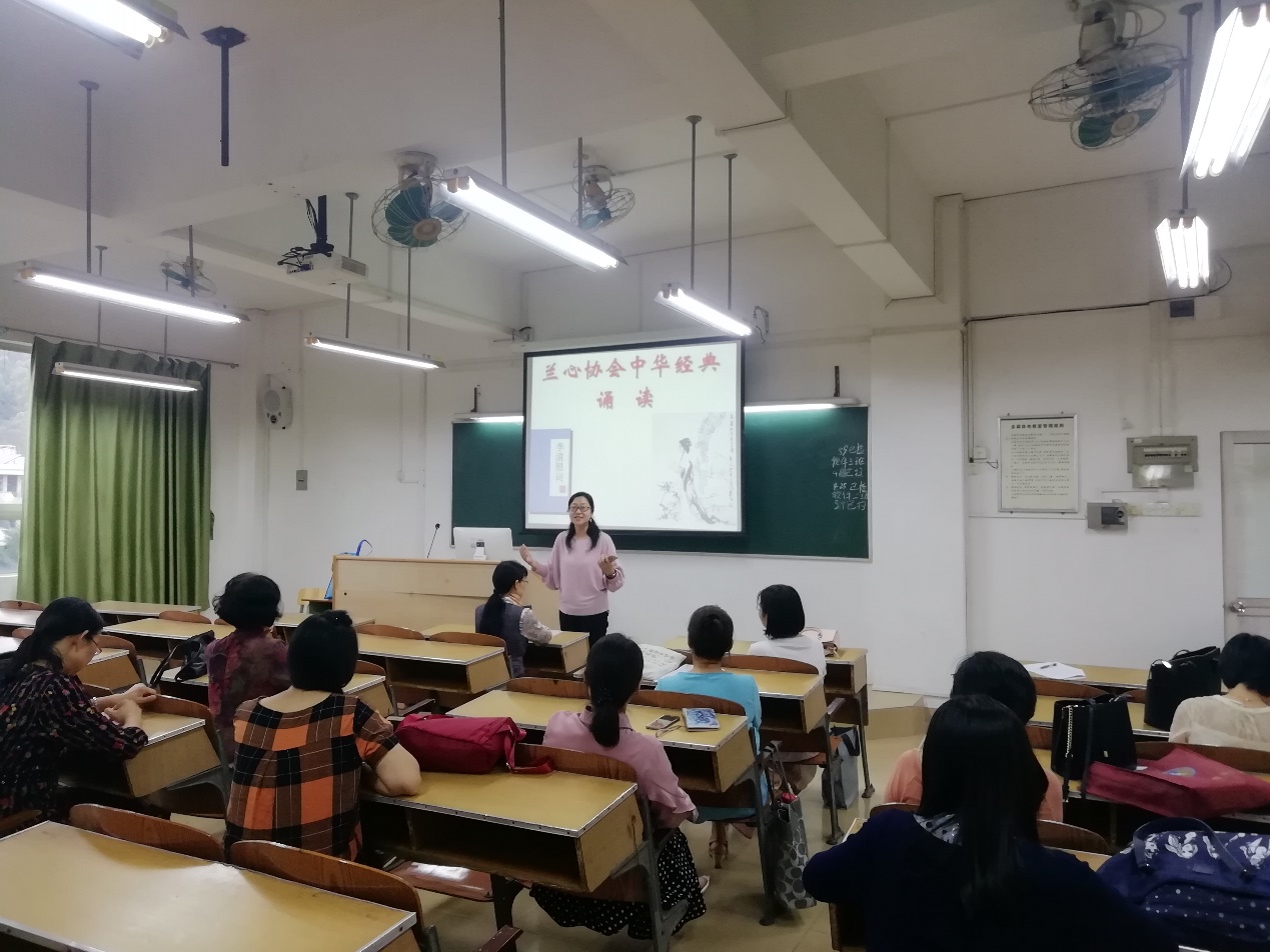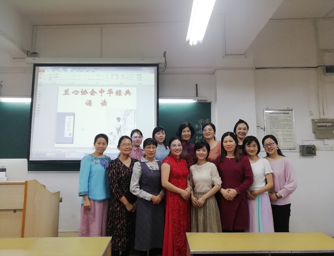 结合学校关于开展《“庆中华人民共和国成立七十周年逐青春韶华梦想”系列主题活动之“诵国之经典展时代新华”中华朗诵会》的通知精神,2019年5月10日下午,兰心协会全体会员齐聚在天河校区西区综合楼501教室,聆听着悠扬的音乐,一起走进古诗词的浩瀚世界,大家一起感受诗的情怀,领悟词句的精妙之处。邓彩云老师给大家讲解了李清照两首《如梦令》的词,带领大家一起诵读李商隐的古诗《夜雨寄北》;李文婷、邱秀芳、黄妍、徐萌四位老师根据自己对文学作品的理解和感悟,以不同的风格演绎着篇篇美文,黄妍老师别具特色的粤语古词吟唱,更是把活动气氛推向了高潮。