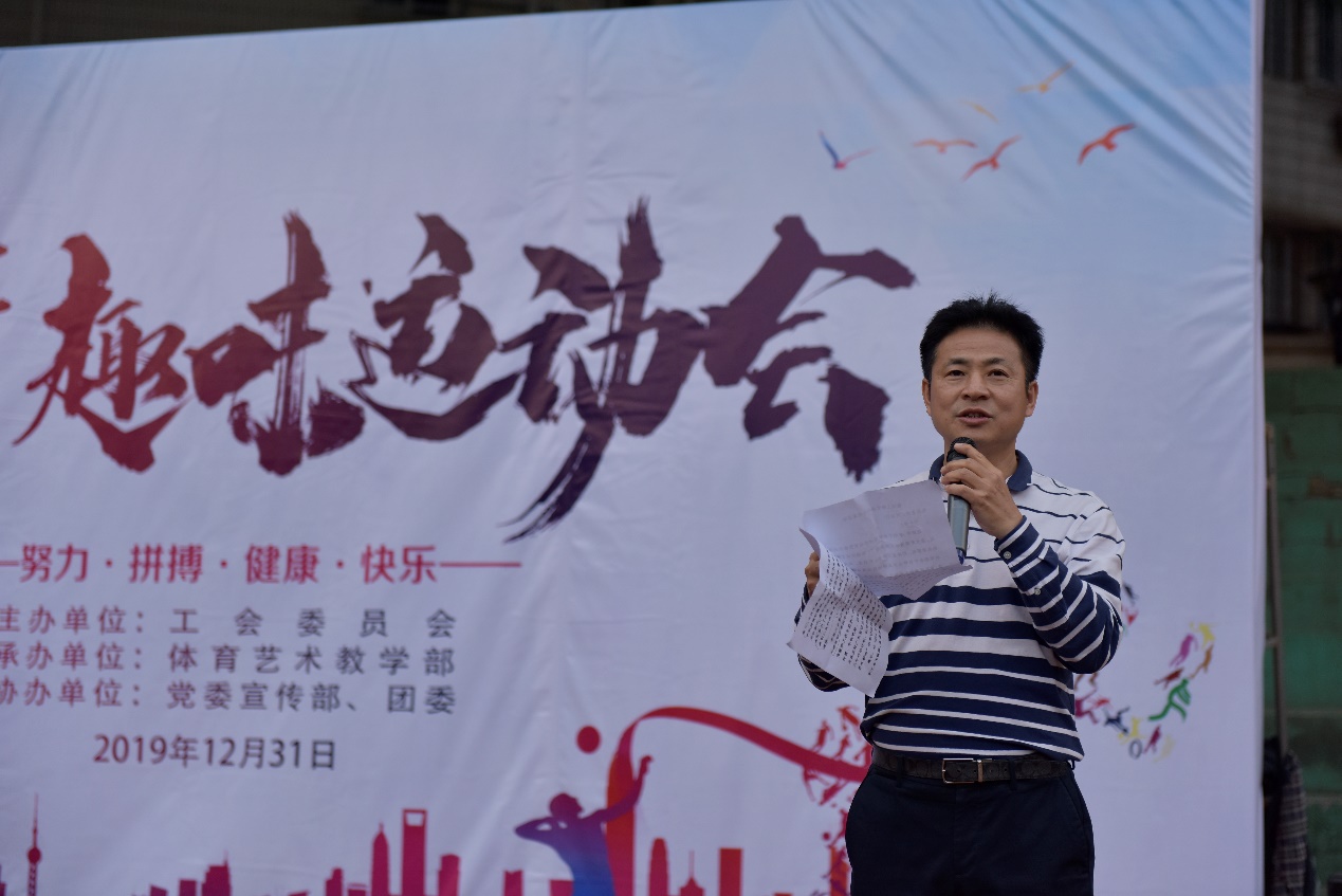 党委副书记、校长何汉武同志致开幕词,他说,运动是生命之本,健康是万事之基,学校工会举办教职工趣味运动会,是为了让教职工在繁忙紧张的工作、生活中解放出来,走下网络、走出课堂、走向操场,舒缓紧张的工作和心理压力,促进身心健康的发展,达到锻炼身体、增强体质的目的!同时也培养了教职工的团队意识、竞争意识和奋勇争先精神,让大家在趣味运动中放飞心情、愉悦身心,振奋精神!