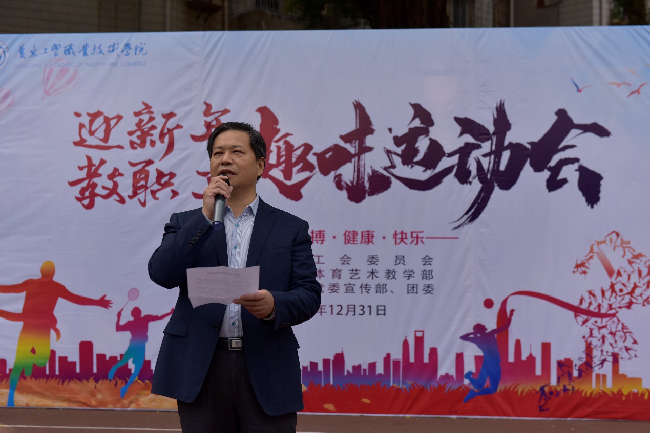 2019年12月31日下午,学校迎新年教职工趣味运动会在天河校区东区运动场举行。本次趣味运动会由工会委员会主办,体育艺术教学部承办和党委宣传部、团委协办。学校党委副书记、校长何汉武,党委委员、副校长、工会主席陈珊兴,党委委员、副校长赵红出席了开幕式,与学校全体教职工共同参与本次趣味运动会。