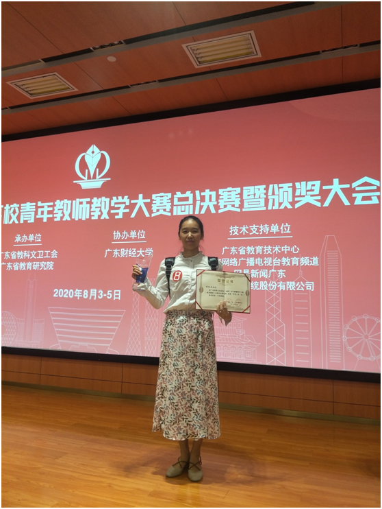 由广东省总工会、广东省教育厅联合举办,由广东省教育研究院和广东省教科文卫工会承办,广东省第五届高校(高职)青年教师教学大赛总决赛于8月4日在广东财经大学举行。总决赛选手源自各小组竞赛的第一名,经过激烈比拼,我校周红云老师再次夺取广东省第五届高校(高职)青年教师教学大赛总决赛一等奖,是在2018年广东省第四届高校(高职)青年教师教学大赛总决赛获得一等奖后,再次获此殊荣。