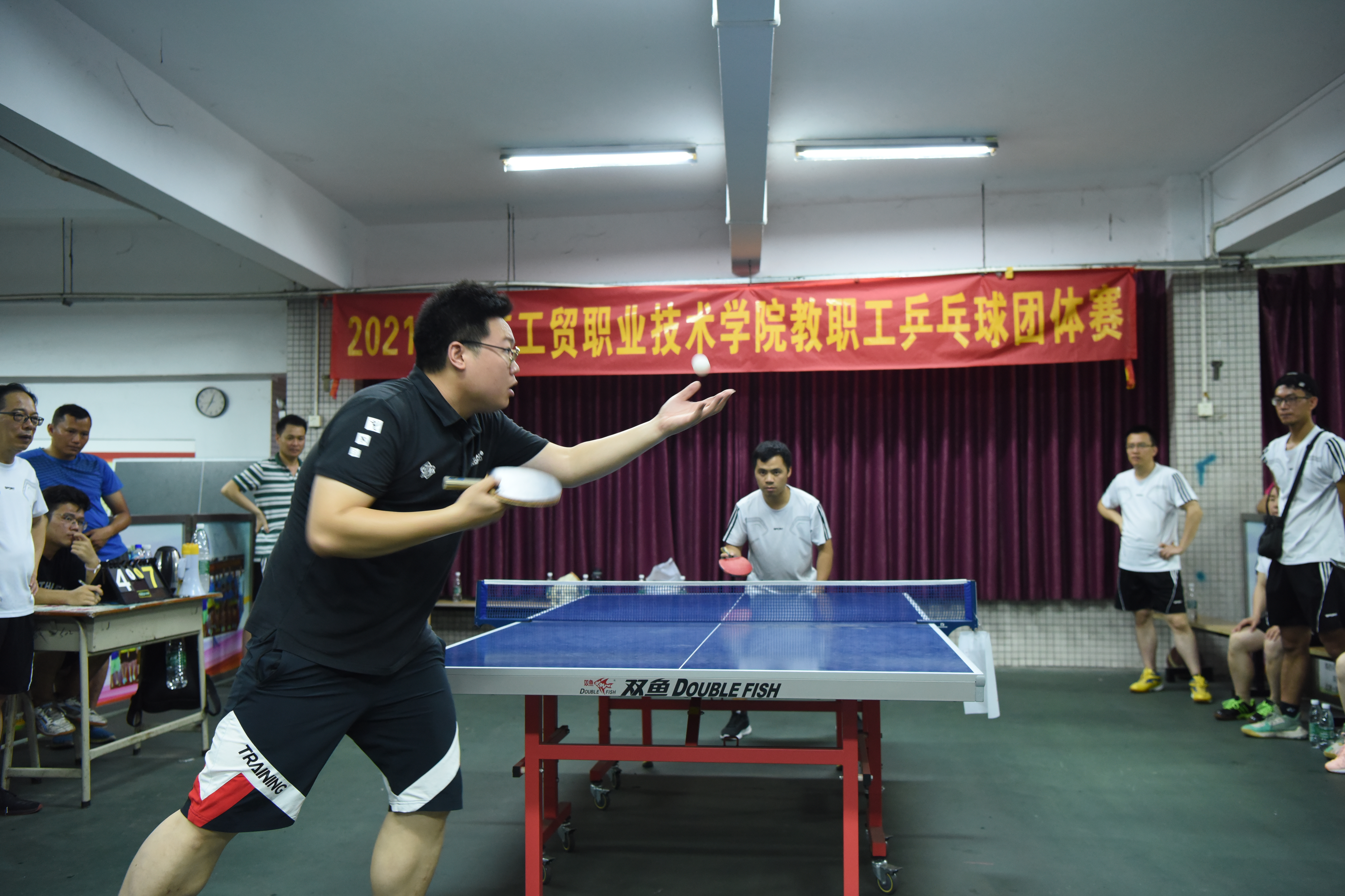 525日下午,学校2021年教职工乒乓球团体赛决赛在天河校区东区乒乓球室打响,经过激烈的比拼,职能教工二队夺本次比赛的冠军,职能教工一队获亚军,学校副校长、工会主席陈珊兴全程观看比赛并为获胜队颁奖。