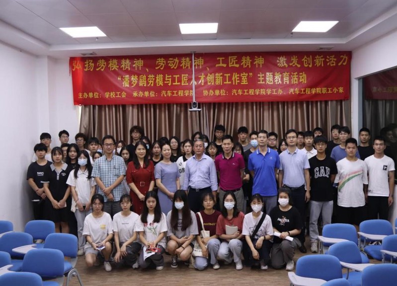 为大力弘扬劳模精神、劳动精神、工匠精神,引导青年学子崇尚劳动、尊重劳动,树立创新强国的精神。5月25日下午,由学校工会主办、汽车工程学院承办的“弘扬劳模精神 劳动精神 工匠精神 激发创新活力—潘梦鹞劳模与工匠人才创新工作室”主题讲座在白云校区教师发展中心举行。主题讲座采取线上线下相结合,学校工会常务副主席赖明瑛、副主席李伟民、汽车工程学院党总支副书记欧敏、应用外语学院副院长邓国栋、新能源汽车技术系主任王锋等老师和学生代表参加。