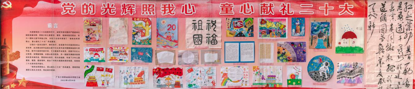 2022510日发布征稿启事至523日截稿,教职工子女向工会递交作品,共收到文字、书法、绘画作品47份,孩子们用天真的艺术表现手法、深情独特的笔触,以充满童真童趣的优美作品,赞美伟大的党、伟大的祖国,表达了对伟大祖国的美好祝愿,向党的二十大胜利召开献礼。