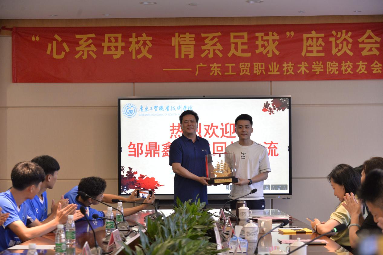 座谈会上,邹鼎鑫校友向学校足球队赠送了纪念品,黄雄志代表学校向邹鼎鑫校友回赠了纪念品。