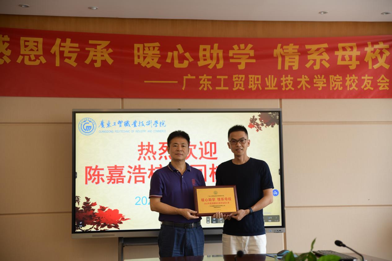 陈嘉浩校友现任广东晟腾地信科技有限公司总经理。谈到设立助学金的初衷,他说,他是在母校、前辈们的支持下成长起来的,特别感谢母校的支持和帮助,怀着一份感恩的心回报学校,帮助母校的贫困学子顺利完成学业,更好地回报社会。希望师弟师妹们传承好母校优良传统,助人为乐的精神和爱心传递下去,用实际行动共同守护我们的母校,展现我们工贸学子良好的精神品质。