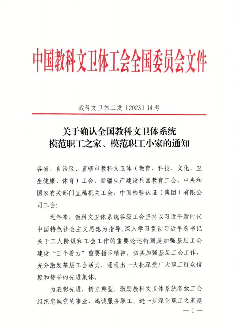 日前,中国教科文卫体工会全国委员会印发《关于确认全国教科文卫体系统模范职工之家,模范职工小家的通知》(教科文卫体工发 [2023] 14号)文件,中国教科文卫体工会决定选树中国教育工会北京外国语大学委员会等180个单位为全国教科文卫体系统模范职工之家,选树清华大学电子工程系工会等181个单位为全国教科文卫体系统模范职工小家,学校工会选树为全国教科文卫体系统模范职工之家。此次在广东省教科文卫工会系统选树为“全国教科文卫体系统模范职工之家”共有6个单位,其中二个为医院系统,二个为高职院校,一个为私立本科学校,一个为高中学校。