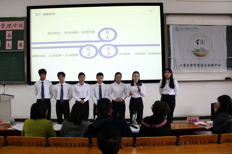接着,是调查报告类作品的展示。选手们在紧张的比赛氛围中能言快语,在规定时间内竭力呈现他们的精彩之作。面对老师的提问,他们对答如流。在考验项目完善度和选手综合能力的答辩环节中,面对评委老师一个个有针对性的问题,选手们临危不乱,应对自如,为观众们呈现了一场紧张而又精彩的比赛。