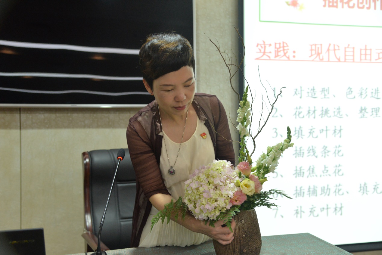 倪老师首先引导学员们理解花道,花艺通过融入心情,形成一种修养,逐渐变为一-种文化, 即是花道。之后,倪老师讲解了东方式、西方式、现代自由式等三种插花艺术风格,三种风格各有风采。东方式插花追求意境美;西方式插花追寻几何对称美;现在自由式插花则无拘无束,追求造型美。接着,倪老师从花材的选购、花材形态等方面讲述了插花艺术的基础知识,内容丰富有趣,大大激发了学员们的学习热情。
