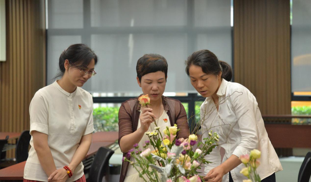 插花,不仅可以美化居住环境,为家庭生活增添美感和温馨,也是探新访友、迎送宾客最高雅、最珍贵的礼品。学会插花,可以与花作伴,以花为友,滋养心灵,陶冶情操,表达情感。2019年5月30日,工商管理学院倪春丽副院长带领李爽老师以及四位学生助教组成社会服务团队,为广东美居物业管理公司提供花艺雅修社会服务。