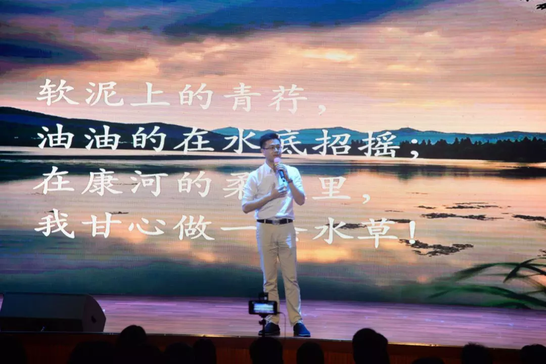 李繁老师带来朗诵表演《再别康桥》,悠扬的音乐配上磁性的嗓音,使大家沉醉在江南那柔美的水波中,提醒我们要珍惜在校的美好时光。最后,成海涛老师对参赛作品进行详细的点评,提出了朗诵要注意形态和姿势,演绎要结合朗诵内容开展等许多宝贵的建议。
