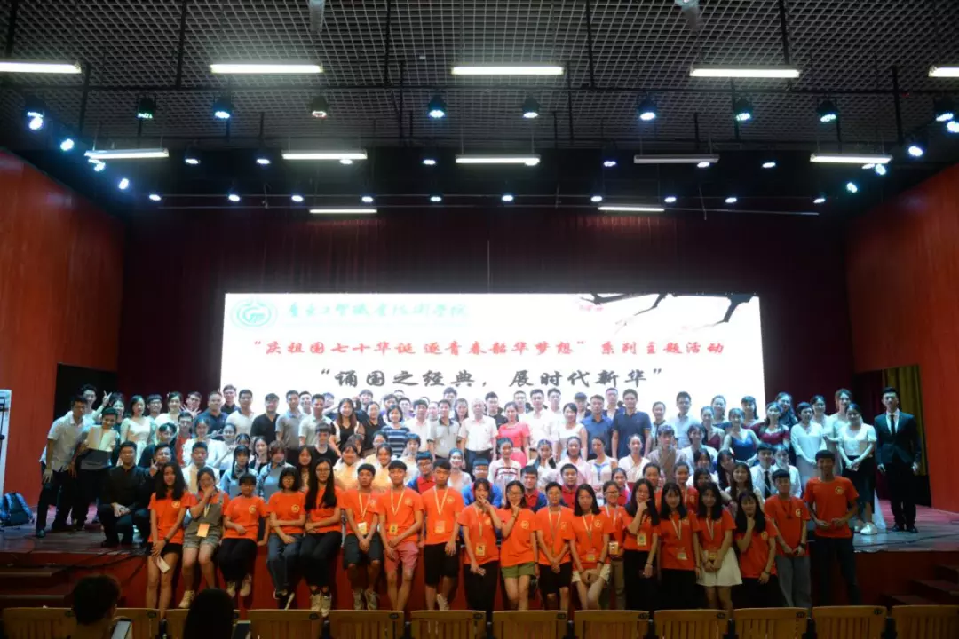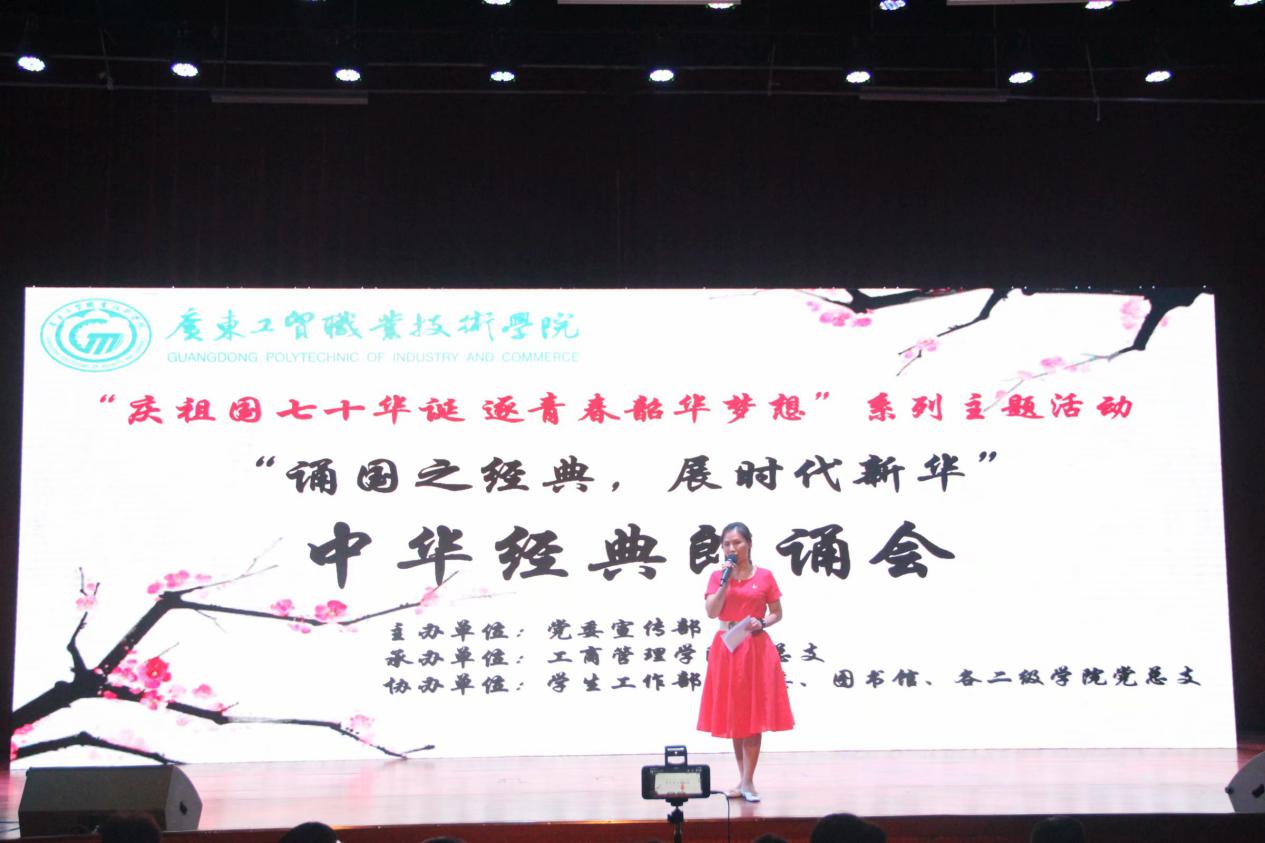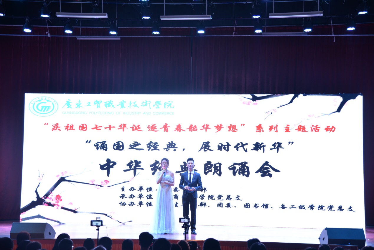 为深刻学习贯彻习近平新时代中国特色社会主义思想和习近平总书记在纪念五四运动100周年大会上的讲话精神,大力弘扬中华优秀传统文化,进一步弘扬、传承和发展中华优秀文化,2019年6月13日晚,由工商管理学院党群服务中心承办的“庆中华人民共和国成立七十周年,逐青春韶华梦想”系列活动之“诵国之经典,展时代新华”中华经典朗诵会白云校区演艺厅隆重举行。