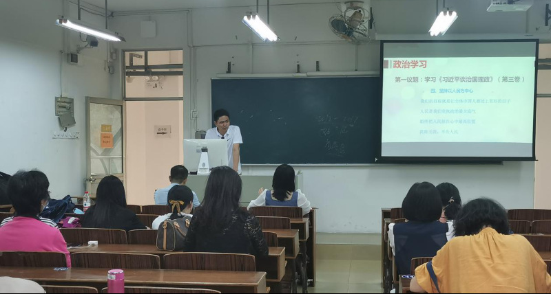 政治学习会议上,首先由党总支副书记谢宏祥带领与会教职工进行第一议题学习——《习近平谈治国理政》第三卷第四专题“坚持以人民为中心”。