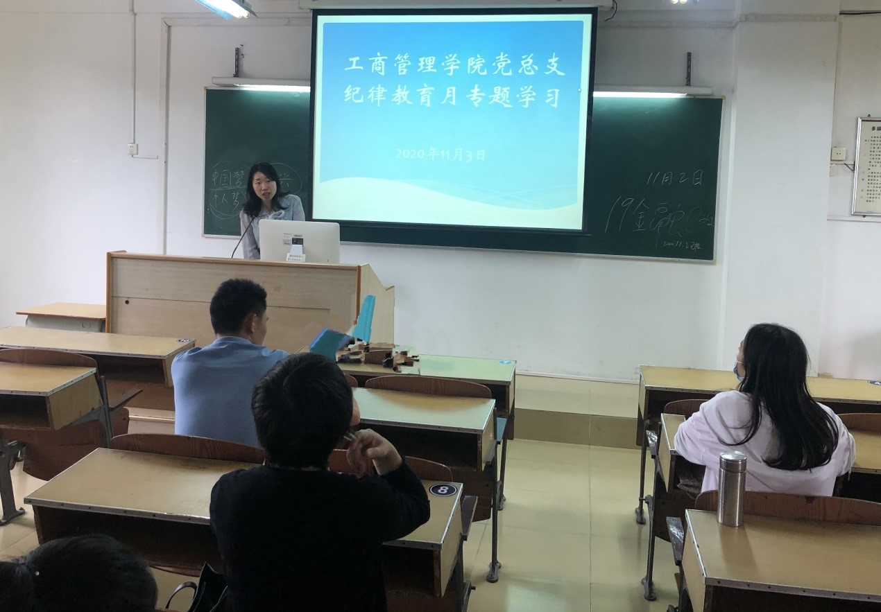 为深入学习贯彻习近平新时代中国特色社会主义思想,推动全面从严治党向纵深发展,工商管理学院党总支于2020年11月3日下午,召开纪律教育月专题学习活动,学习由工商管理学院党总支书记周清莲主持,全体教师党员参加。