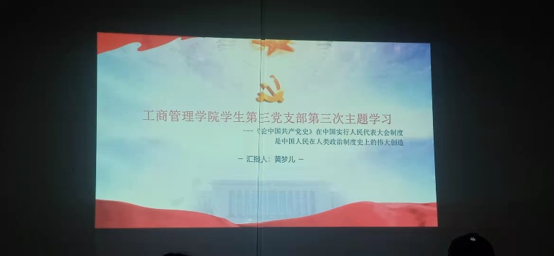 本次学习内容是习近平《论中国共产党历史》“在中国实行人民代表大会制度,是中国人民在人类政治制度史上的伟大创造”一篇,由学生党员黄梦儿领学。她向与会党员阐述了中国实行人民代表大会制度的历史背景和现实意义,在中国实行人民代表大会制度是中国人民翻身作主、掌握自己命运的必然选择。习近平总书记在文中指出:“六十年实践充分证明,人民代表大会制度是符合中国国情和实际、体现社会主义国家性质、保证人民当家作主、保障实现中华民族伟大复兴的好制度……在新的奋斗征程上,必须充分发挥人民代表大会的根本政治制度作用,继续通过人民代表大会制度牢牢把国家和民族前途命运掌握在人民手中。这是时代赋予我们的光荣任务。”作为学生党员更应当了解我国的根本制度,认真学习中国历史和党的历史,增强“四个意识”、坚定“四个自信”、做到“两个维护”。