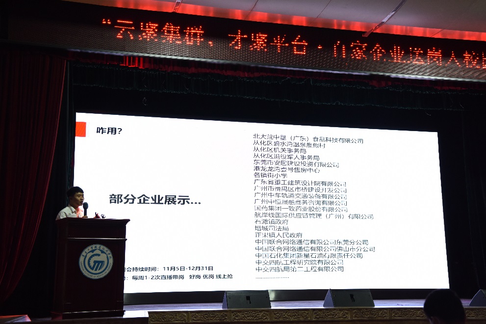 随后,严捷介绍了励弘文创旗舰园的基本情况以及介绍了园区里实力强劲、发展迅猛的近十家企业概况。目前,园区企业对文化创意类产品设计人才、科技创新人才、程序开发工程师等有大量需求。严捷还为应届生带来了部分园区的优质岗位,分别来自广州奇境科技有限公司、施德朗(广州)电气科技有限公司、小翼科技(广州)有限公司等企业,为同学们做了简单的介绍以及推荐。