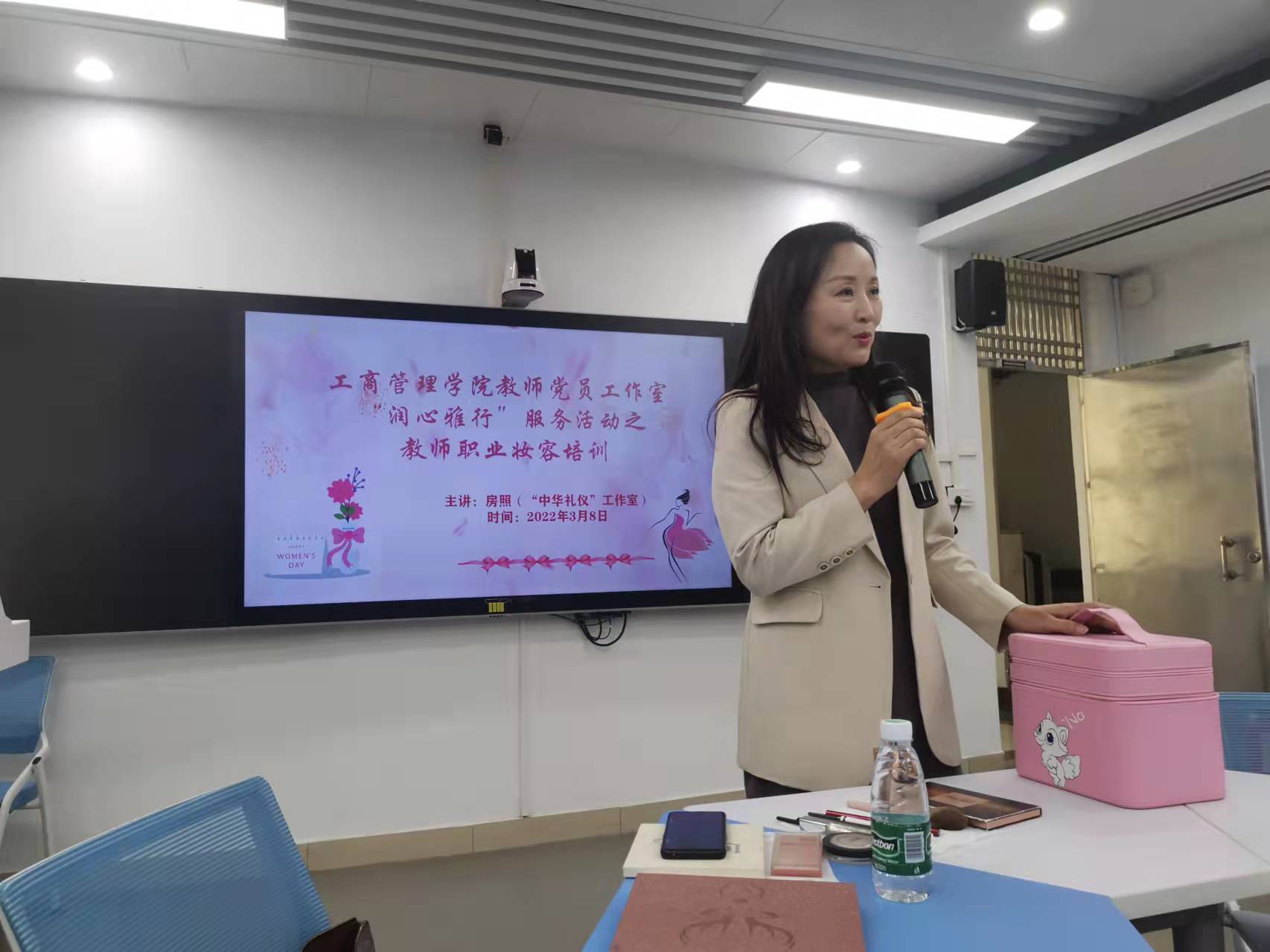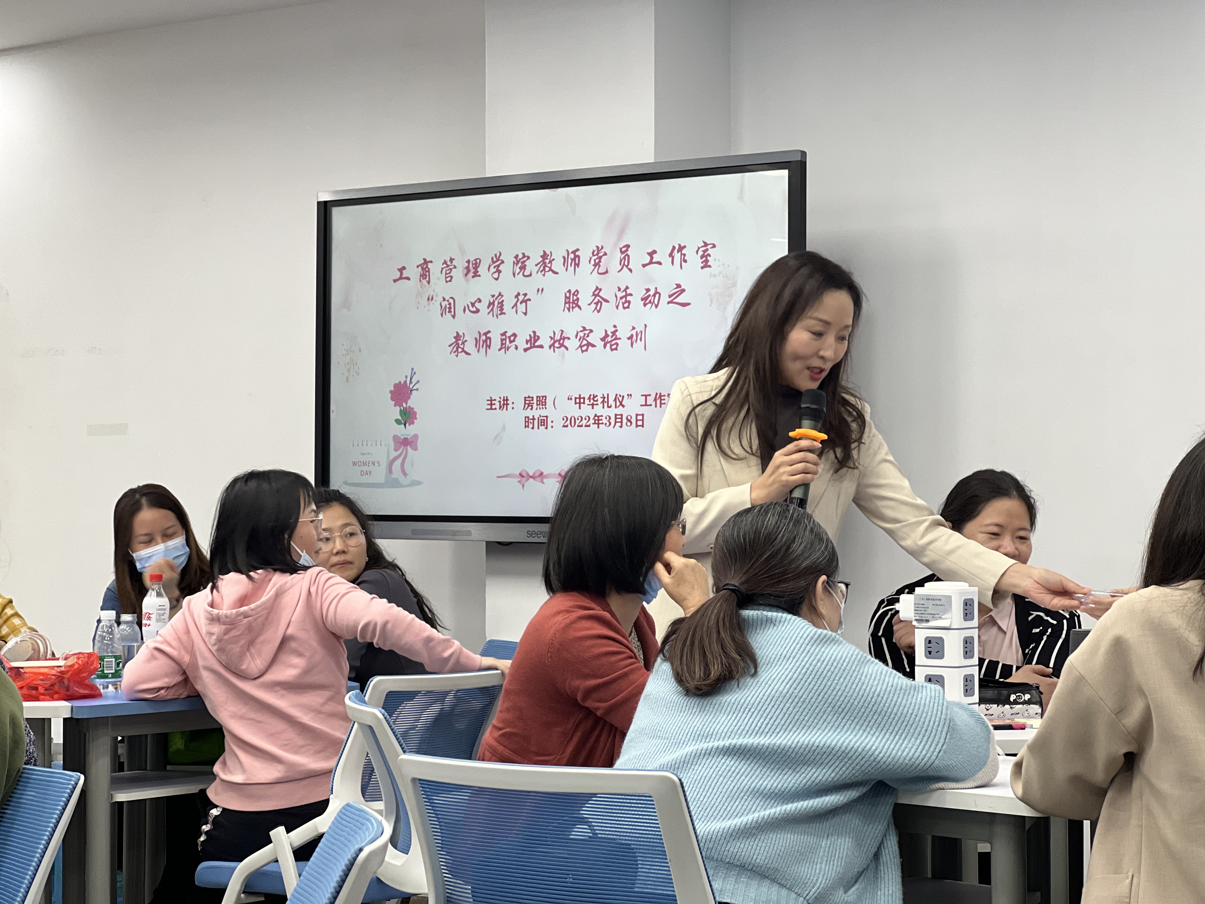庆祝第112个“三八”国际劳动妇女节,丰富女教职工的精神文化生活,提升女教师个人形象魅力,38日下午工商管理学院教师党员工作室开展“润心雅行”服务活动,在天河校区西综合楼205为学院全体教职工开展职业妆容培训,活动由 “中华礼仪”党员工作室主持人房照老师主讲。工商管理学院党总支书记周清莲主持并进行开场讲话,鼓励全体女教师争做新时代内外兼修的“最美教师”