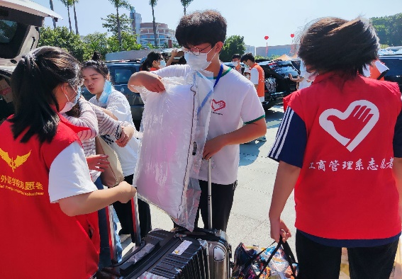 活动过程中,志愿者们统一身穿红色马甲,分工明确,相互配合,各项工作开展得紧锣密鼓、井井有条。志愿者们带着热情的微笑迎接每一位新同学,协助新生搬运行李到达校巴处,带领他们去到宿舍放行李,引导他们前往三栋架空层进行注册及报到。志愿者们的服务热情周到,言谈举止文明,给新生展现了互助友爱的精神风貌。