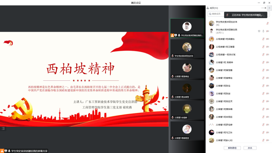 校学生党史宣讲团成员、工商管理学院学生第三党支部谢欣燕同志于2022年10月25日面向工商管理学院2022级商务管理1班开展了“西柏坡精神”线上党史宣讲。