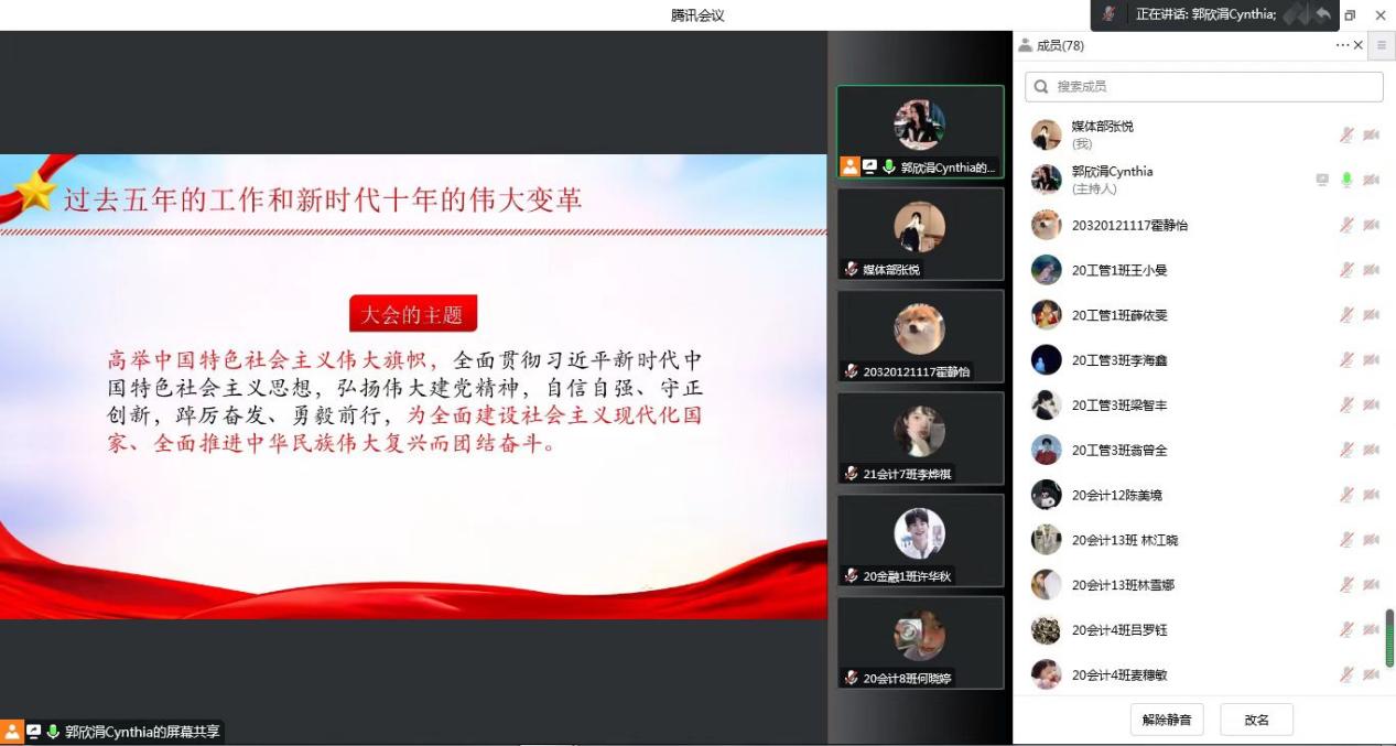 为深入学习宣传贯彻党的二十大精神,教育引导广大学生感党恩、听党话、跟党走,12月20日晚,党的二十大精神学校宣讲员、工商管理学院辅导员郭新娟通过腾讯会议开展党的二十大精神线上宣讲会,财税服务系全体学生参加了学习。