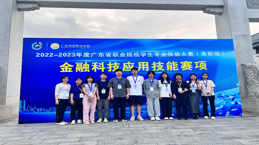 4月22日,2022-2023年度广东省职业院校学生专业技能大赛(高职组)金融科研应用技能赛项在广东科贸职业学院顺利开赛,我校工商管理学院金融科技应用专业8名学生在金融科技应用专业负责人叶方方老师及江暮红教授、袁年英副教授带领下参加该项比赛。
