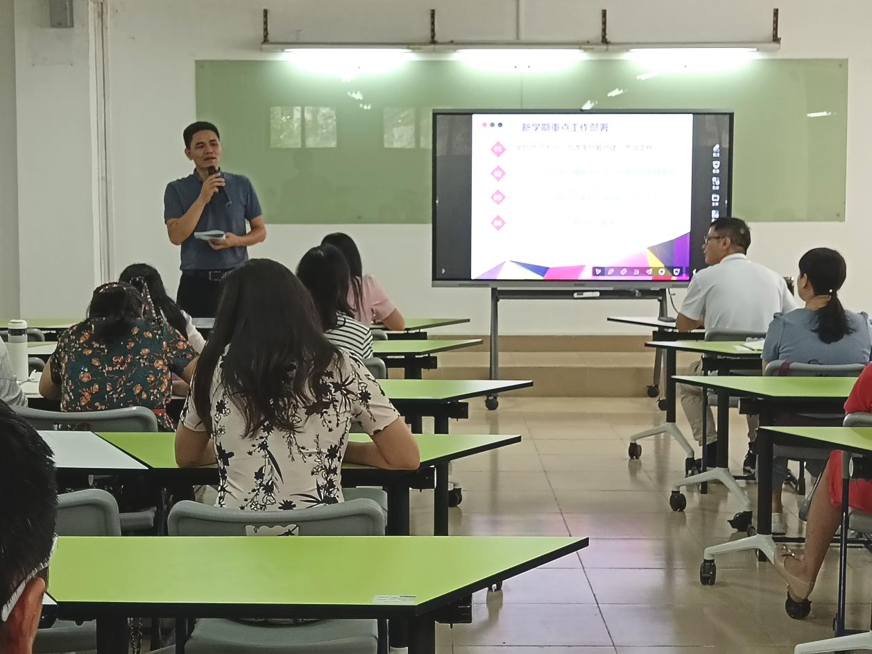 学院党总支副书记谢宏祥部署了新学期学生管理工作。通过通报2023届毕业生毕业去向落实情况、升学情况、征兵情况和新生录取情况,谢宏祥部署了新生入学工作实施方案,强调要确保学生返校安全、平稳、有序,任课老师严格要求课堂纪律,值班老师要多开展学生走访工作,关心学生安全,深入了解学生生活情况、心理状况、学习感受等。
