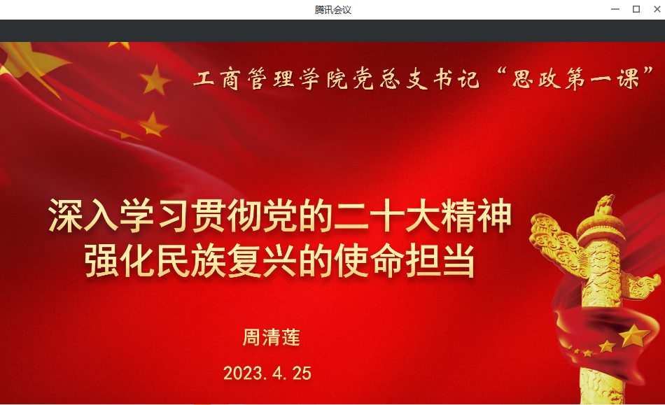 为深入学习贯彻习近平新时代中国特色社会主义思想和党的二十大精神,教育引导学院团学组织干部进一步坚定理想信念,努力成长为堪当民族复兴重任的时代新人。2023年4月25日晚,工商管理学院党总支书记周清莲通过腾讯会议线上为来自工商管理学院120名团学组织干部讲授“思政第一课”。