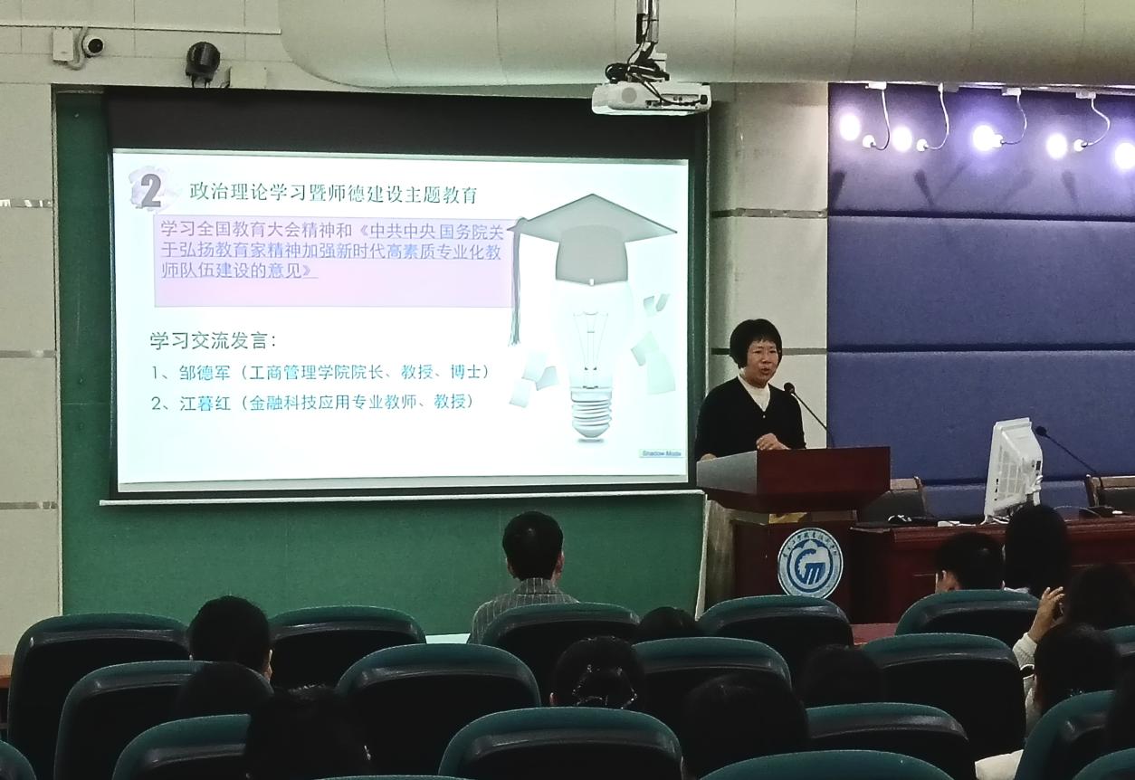 教育是强国建设、民族复兴之基,教师是立教之本、兴教之源。为进一步弘扬教育家精神,打造师德高尚、业务精湛、结构合理、充满活力的高素质专业化教师队伍,9月24日下午,工商管理学院在天河校区西区报告厅举行教职工政治理论学习暨师德建设主题教育大会。会议由工商管理学院党总支书记周清莲主持,工商学院全体教职工参加。