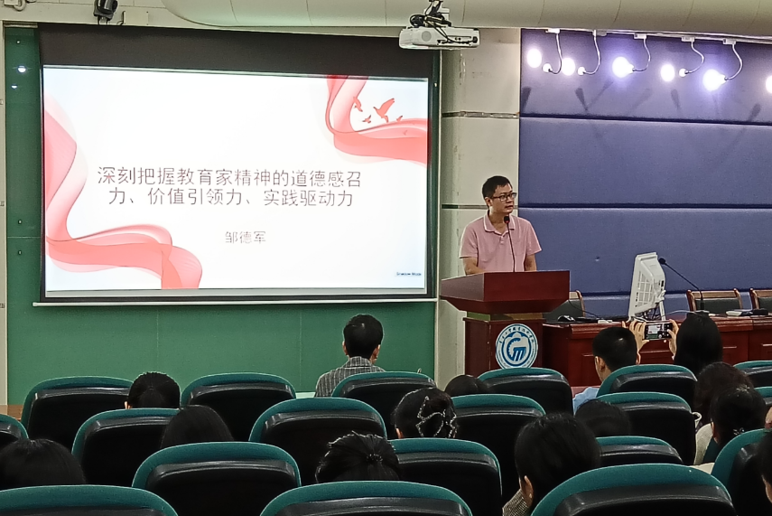 工商管理学院院长邹德军带领全体教职工学习了全国教育大会精神和《中共中央国务院关于弘扬教育家精神加强新时代高素质专业化教师队伍建设的意见》,并以《深刻把握教育家精神的道德感召力、价值引领力、实践驱动力》为主题,向学院教职工深刻阐述教育家精神,从理想信念、道德情操、育人智慧、躬耕态度、仁爱之心、弘道追求六个方面对教师提出全面要求。