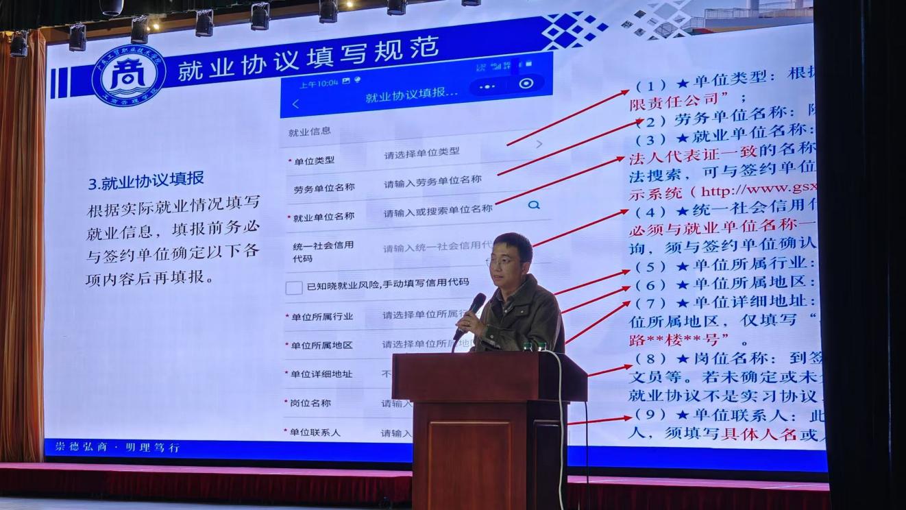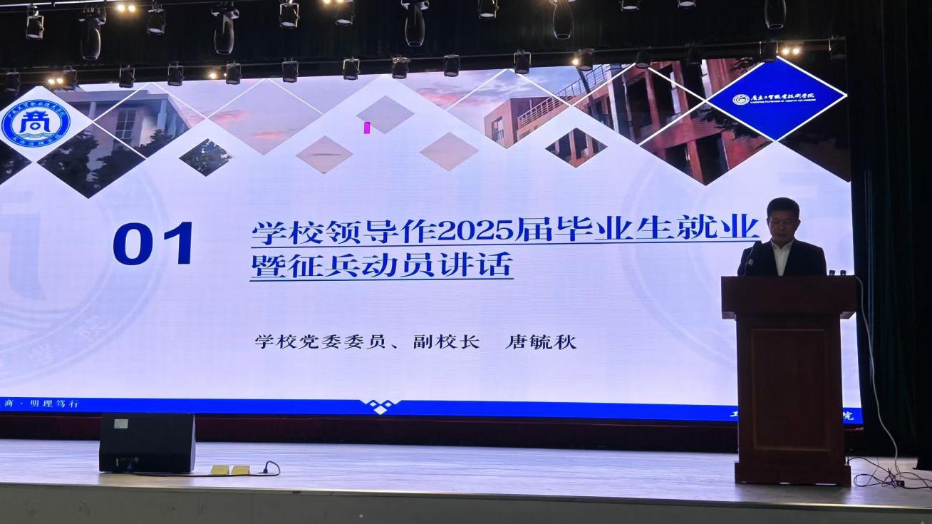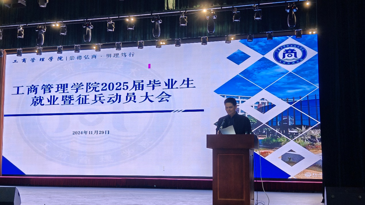 为全面贯彻党的二十届三中全会精神和全国教育大会精神,推进毕业生就业创业工作和大学生征兵工作的决策部署,全力做好2025届毕业生就业创业指导服务和征兵工作,工商管理学院于11月29日在白云校区学生活动中心报告厅面向学院全体2025届毕业生召开了就业暨征兵动员,学校党委委员、副校长唐毓秋出席会议并发表讲话,工商管理学院党总支书记周清莲、副书记谢宏祥及毕业班辅导员、班主任参加了会议,会议由谢宏祥主持。