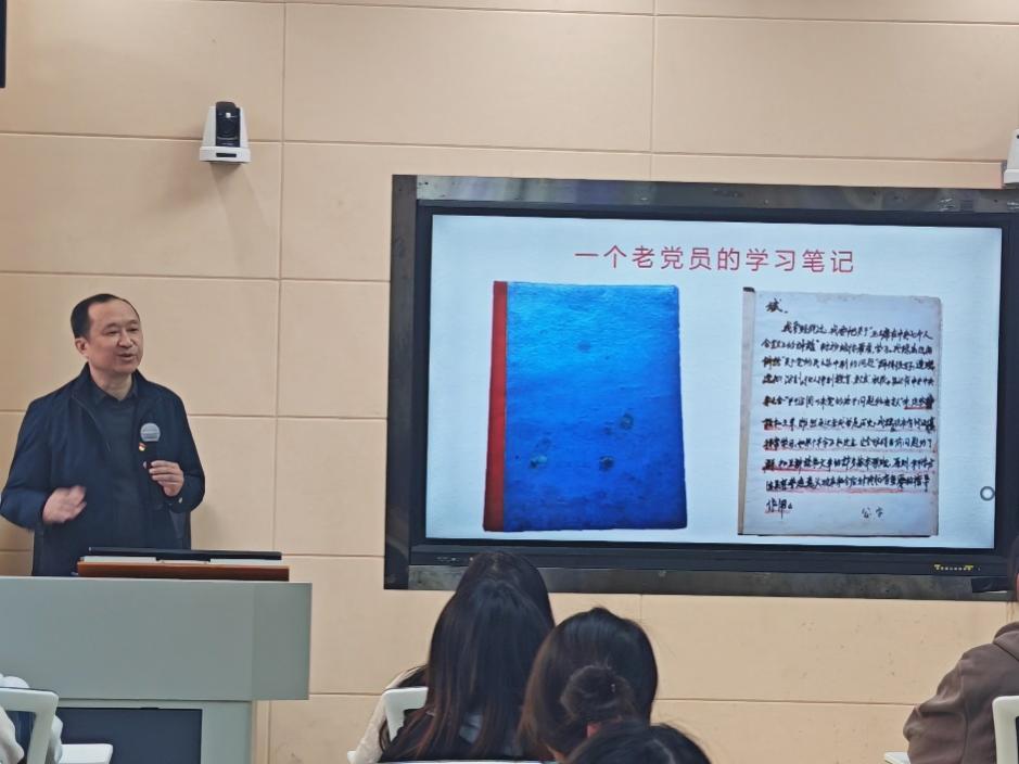 陈斌以“品读红色笔记 传承革命薪火”为主题,以一位老党员的学习笔记为主线,通过笔记中满载质朴真挚的文字,向同学们展现了老一辈革命家对党和国家前途命运的牵挂,对革命理想的执着。此外,陈斌还以自身为例,讲述了其外公对家族年轻一辈的要求,叮嘱年轻人时刻秉持为党效力、为国效力的信念,能以高昂的政治激情、饱满的精神面貌,积极投身于祖国的建设和发展中。陈斌希望青年学子能通过不断努力与实践,在新时代征程中传承先辈精神,为党和国家事业不懈奋斗。
