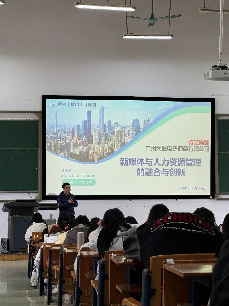 此次活动中,广州大匠电子商务有限公司总经理肖鸣声先生受邀,为工商管理学院人力资源管理专业的学生带来一场题为“新媒体与人力资源管理的融合与创新”的期末实训课堂。肖总以其丰富的行业经验和独到的见解,深入浅出地讲解了新媒体时代为人力资源管理带来的挑战与机遇,以及如何将新媒体技术融入人力资源管理实践,实现管理效率与影响力的双重提升。