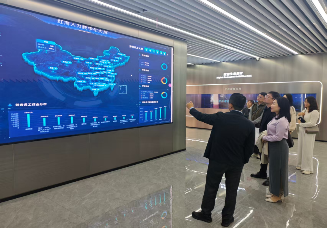 调研首站走进红海数智生态展厅,团队实地感受“科技+就业”的创新实践,现场体验了“AI就业面试机”与“AI直播机”的高效流程。红海集团打造的直聘平台为求职者免费提供人才画像分析服务,精准匹配岗位需求。通过“红海云课堂”培训体系,学生可学习职业技能相关知识,提升就业竞争力。