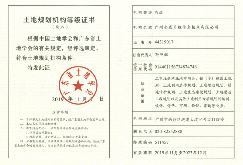 全成地信集团持有测绘和土地规划资质证书齐全,是广州市高新技术企业和科技小巨人企业,连续十年以上守合同重信用企业。