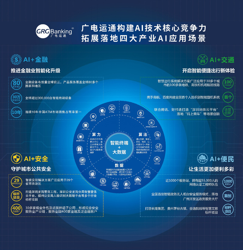 广电运通创立于1999年,是国有控股的高科技上市企业(证券代码:002152),主营业务覆盖智能金融、公共安全、交通出行、政务、大文旅、新零售及教育等领域,为全球客户提供具有竞争力的智能终端、运营服务及大数据解决方案,致力于成为领先的行业人工智能解决方案提供商。
